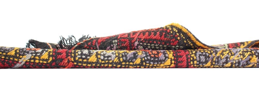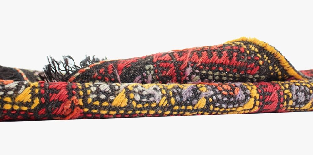 The technique involves wrapping coloured weft threads over and under the warp threads, adding strength and embroidery like pattern.