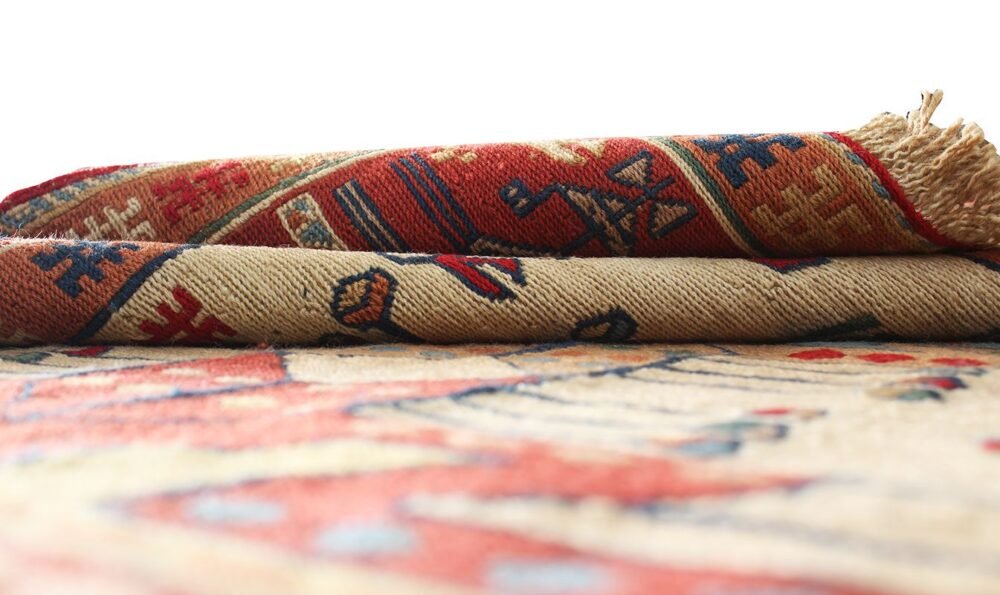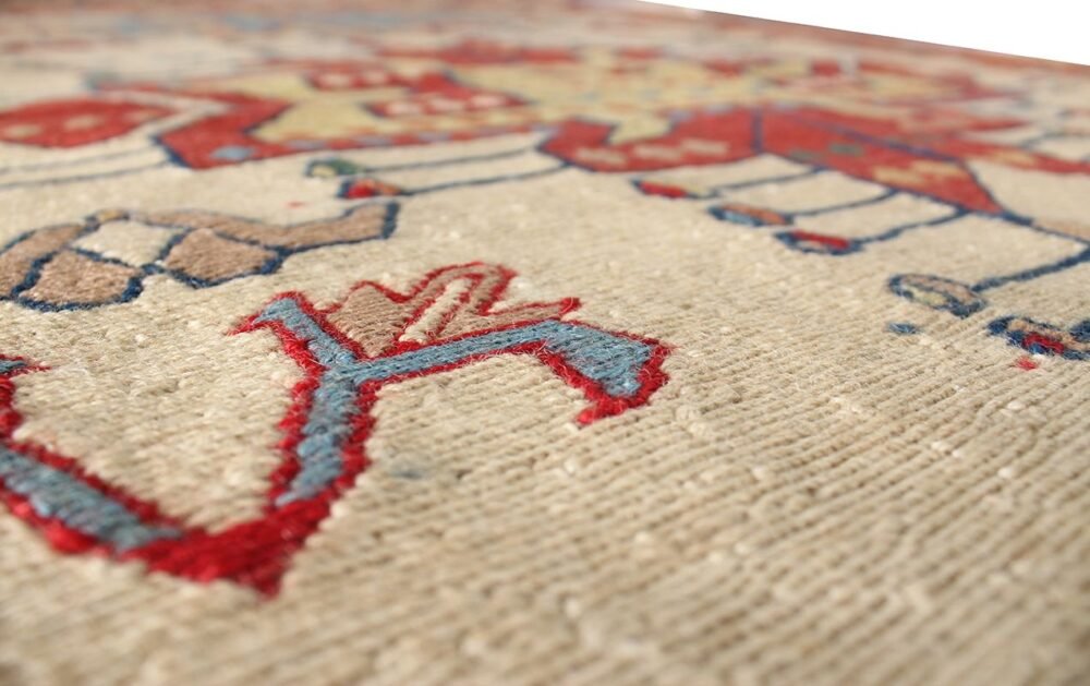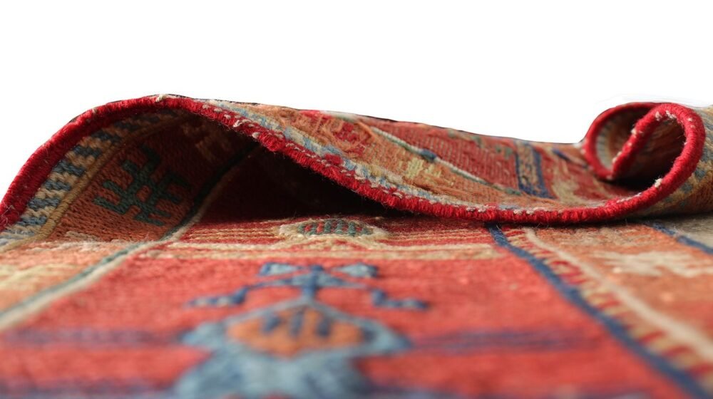 In its elaboration the warp is stretched to one side and the weft yarn is passed under four warp yarns which are then made back on the reverse under 2 yarns, then advanced again on 4 yarns and thus repeating the same steps. The kilim rahrah lacks the same characteristics as kilim, since it is usually woven with additional weft yarns as continuous supports.