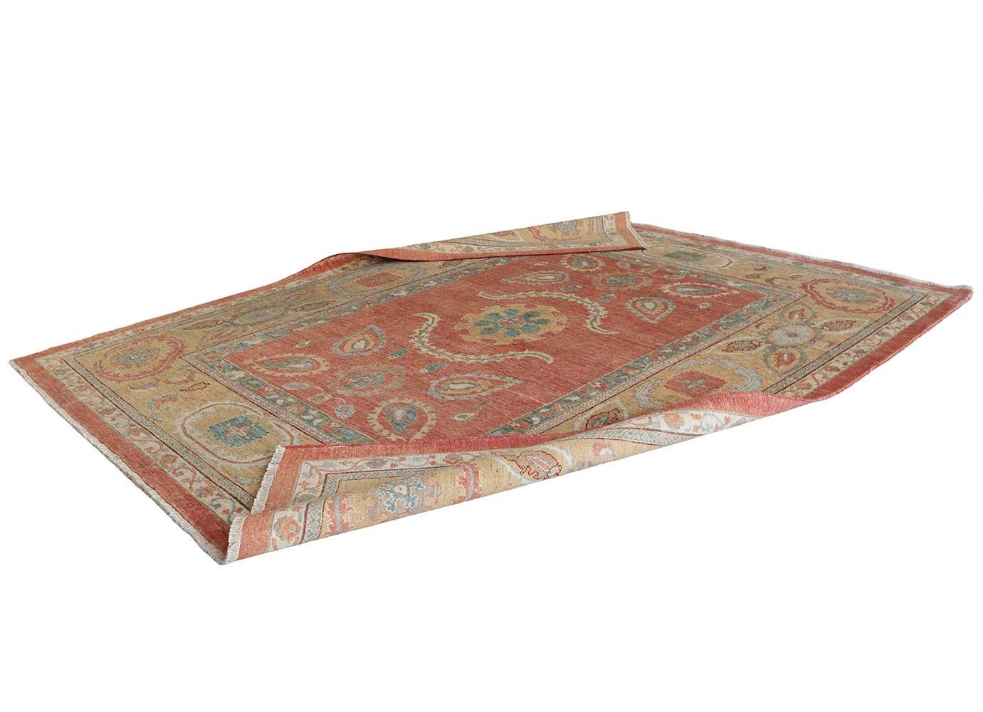 Esta alfombra turca clásica de lana ha sido tejida a mano por artesanos de Anatolia, siguiendo métodos tradicionales transmitidos durante generaciones. Su diseño atemporal, con tonos rojizos, dorados y toques azul verdoso, aporta elegancia y calidez a cualquier estancia del hogar.