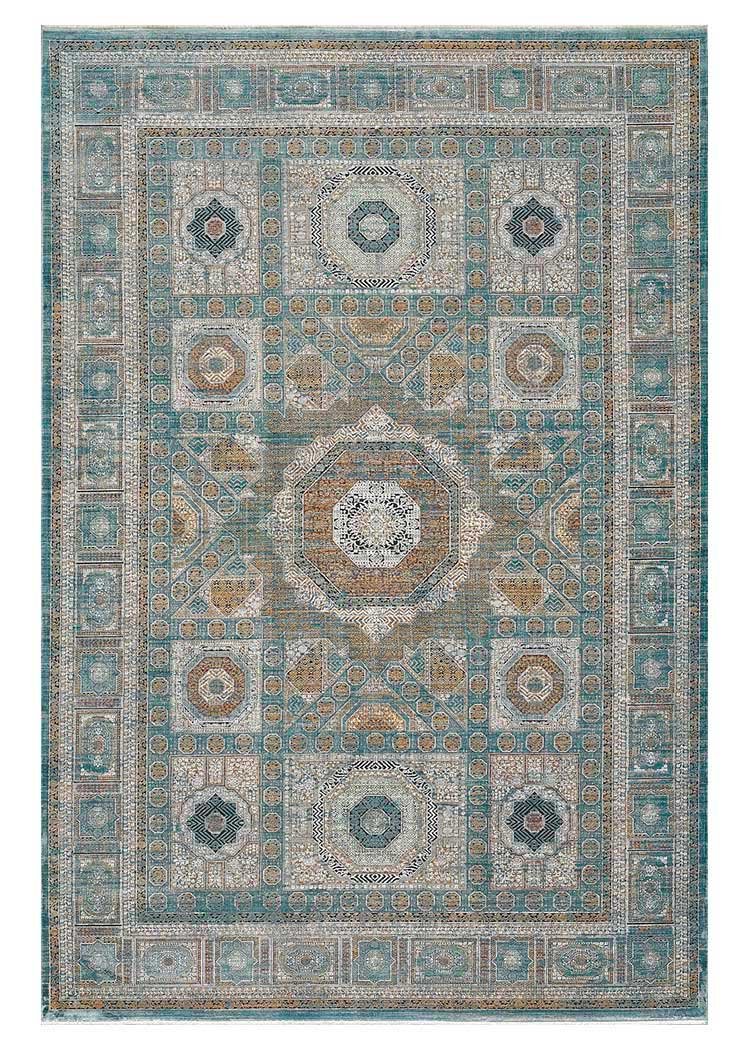El patrón simétrico, inspirado en motivos arquitectónicos, crea un efecto visual armonioso que llama la atención sin sobrecargar el ambiente. El acabado levemente desgastado aporta ese efecto vintage que está en tendencia, haciendo de esta alfombra una elección ideal tanto para interiores clásicos como para estilos más contemporáneos o bohemios.