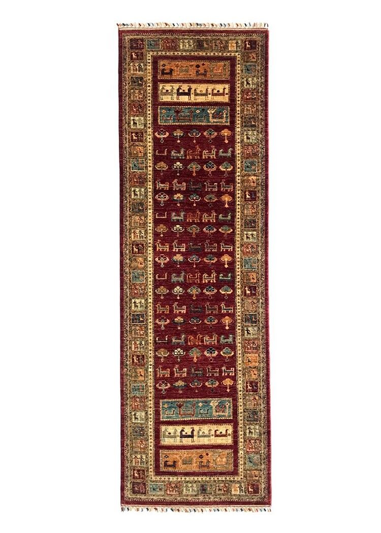 Esta alfombra persa de pasillo está tejida a mano con un diseño tradicional que combina arte, historia y funcionalidad. Su composición presenta una rica base en rojo granate, decorada con patrones repetitivos de inspiración tribal que incluyen símbolos florales y figuras geométricas, típicos de las alfombras persas nómadas.