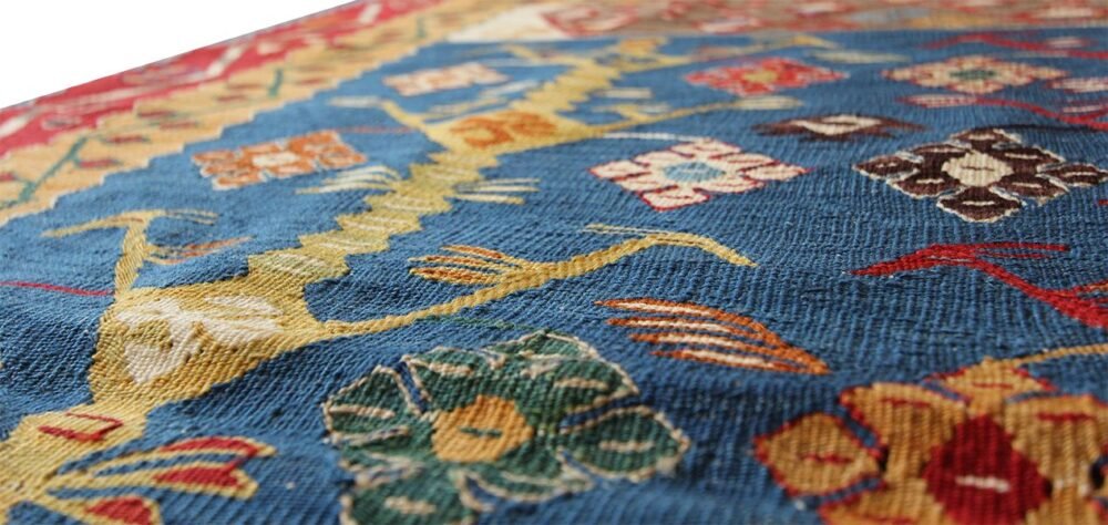 El diseño de este kilim replica presenta una composición central simétrica adornada con motivos geométricos y florales. Los colores vibrantes, como el azul intenso, el rojo y el verde, son obtenidos de tintes naturales, lo que no solo embellece el kilim, sino que también respeta las técnicas tradicionales.